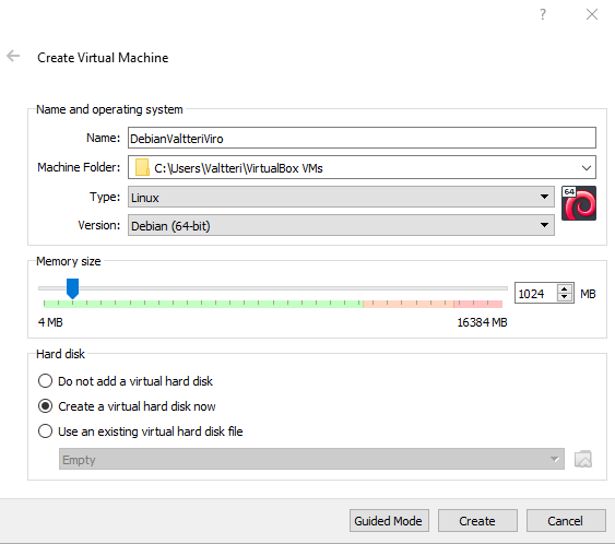 - Luon systeemille nimen, sekä määritän virtuaalikoneen tyypin, version sekä sijainnin tietokoneeni hakemistossa.
