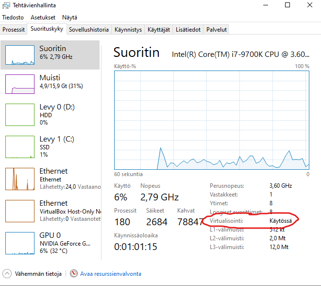 - Ennen asennuksen aloittamista minun tulee sallia virtualisointi Windows-käyttöjärjestelmässäni. Virtualisoinnin tilanteen saan tarkastettua tehtävienhallinnasta. Täältä siirryn osioon:”suorituskyky”, minkä oikeassa alakulmassa lukee listattuna erilaisia ominaisuuksia mistä yksi on virtualisointi.